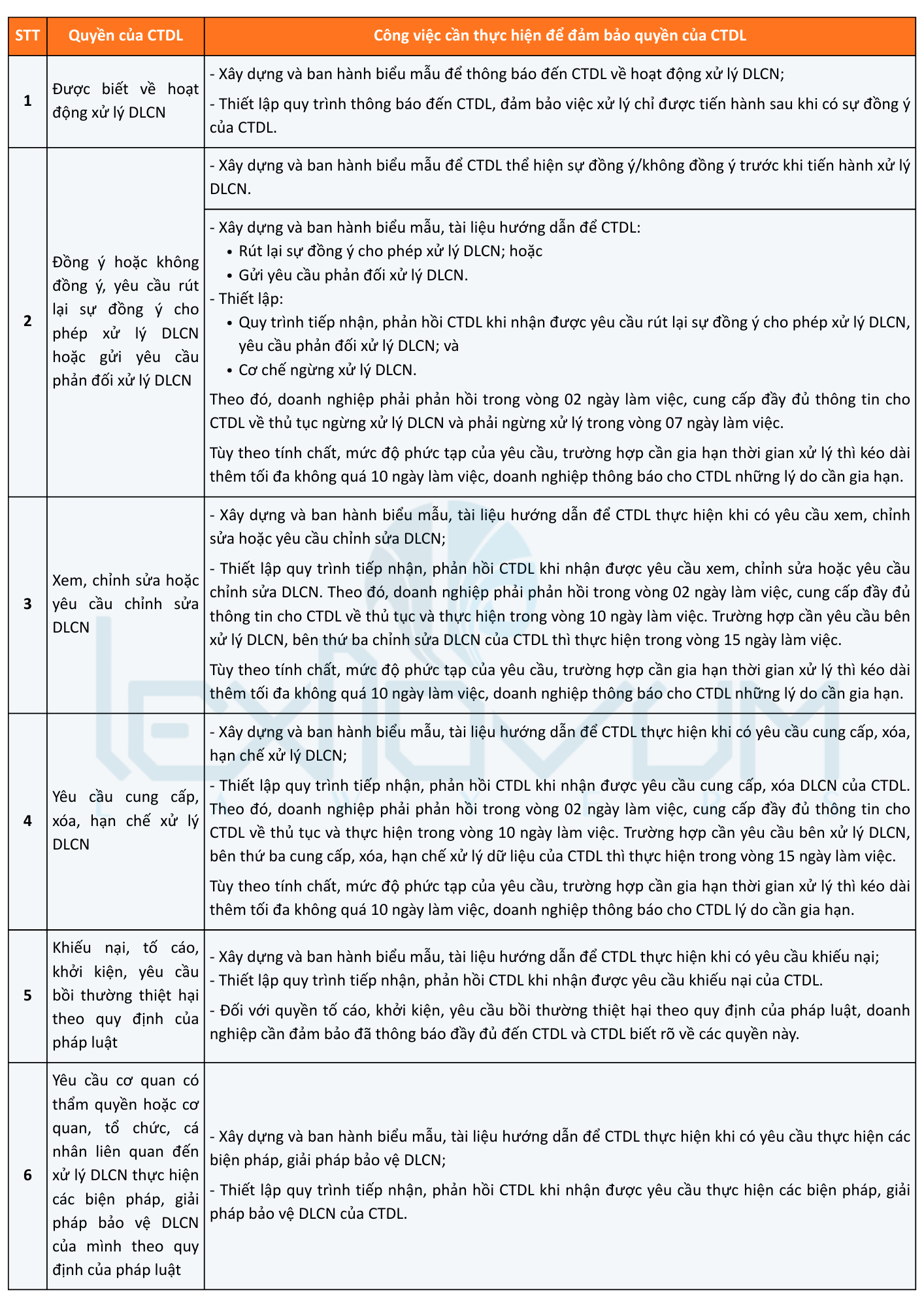 Đối chiếu với quy định tại Điều 4.1 Luật BVDLCN về quyền của chủ thể dữ liệu (“CTDL”), LNV minh họa một số công việc doanh nghiệp cần thực hiện để đảm bảo các quyền của CTDL được thực thi đầy đủ và hiệu quả: